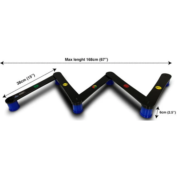 5 sections de 38cm chacune (total 1,65 m) et de 8,5cm de haut reliées par des plots articulés.